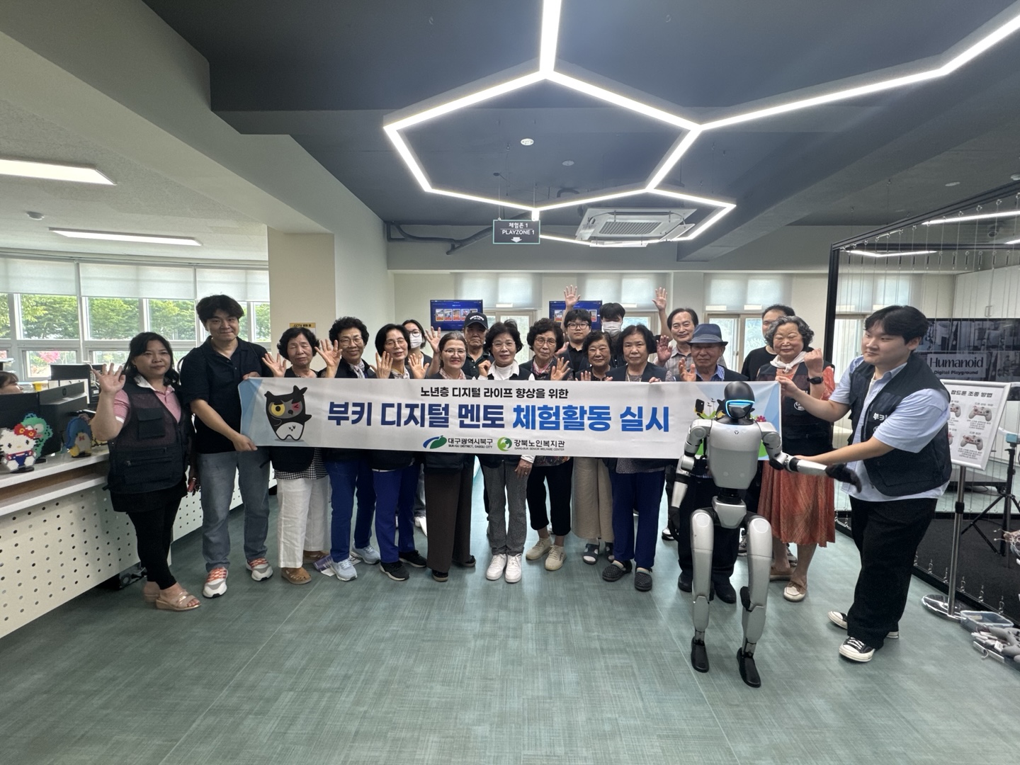 - 사업/행사명 : 2025년 부키 디지털멘토 참여자 체험학습 실시 - 기간/일시 : 2025. 7. 23.(수) 15:00 ~ 17:00 - 내용 디지털 기술을 배우고, 익힌 내용을 또래 어르신들과 나누는 「부키 디지털멘토」 사업을 운영하였습니다. 이 사업은 디지털 교육을 수료한 어르신들이 멘토가 되어, 지역 내 경로당 등을 방문해 또래 어르신들(멘티)에게 스마트폰 사용법과 기초 앱 활용 방법 등을 알려주는 ‘노노케어’ 방식의 교육 지원 활동입니다. 멘토로 참여한 어르신들은 디지털 역량 강화를 위해 대구 달서 디지털체험센터를 방문하여 VR, AI 로봇 등 다양한 디지털 기술을 직접 체험해보는 시간을 가졌습니다. 이번 체험학습은 어르신들에게 기억력과 주의력 향상은 물론, 일상생활 속에서 디지털 기술을 자연스럽게 활용할 수 있는 실질적인 감각을 익히는 소중한 기회가 되었습니다. |
