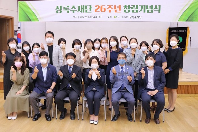내 가족처럼 내 부모처럼 저희 상록수재단이 26번째 생일을 맞이했습니다. 이번 창립기념식은 코로나19 방역수칙을 준수한 가운데 ZOOM 을 이용하여 진행되었으며, 올해부터 시행되는 직원휴가지원프로그램인 '휴프로그램' 당첨자들에 대한 휴가비 전달, 이사장님 인사말, 케이크커팅식 단체사진촬영 순으로 진행되었습니다. '내 가족처럼 내 부모처럼'이라는 슬로건을 바탕으로 지역 내 어르신과 아동들의 복지증진을 위해 26년동안 열심히 달려왔습니다. 저희 상록수재단이 이처럼 오랜 기간동안 꾸준히 지역사회에 이바지 할 수 있었던 것은 뜻을 함께 해주신 후원자분들, 자원봉사자분들을 포함한 많은 분들이 있었기에 가능했습니다. 저희 상록수재단은 지금 이 자리에서 머물지 않고 지역사회를 위해 한 걸음 더 나아가도록 하겠습니다. 저희 상록수재단의 26번째 생일을 축하해주신 많은 분들께 이 자리를 빌어 진심으로 감사드립니다. |