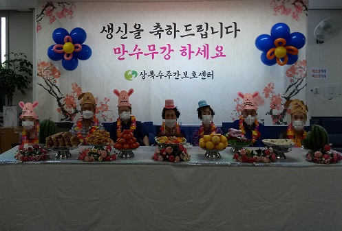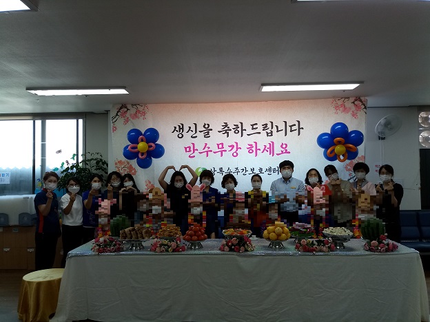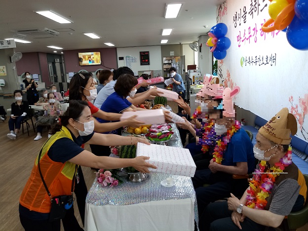 -사업명 : 가족지지 프로그램 “어르신 생신잔치” -일 자 : 매월 마지막 주 수요일 -내 용 : 7월 생신잔치 프로그램 및 잔치를 통하여 자아만족도를 높일 수 있는 계기가 되었습니다. 직원과 어르신들 모두가 어울려 참여함으로써 더욱더 돈독한 유대관계를 형성할 수 있습니다. |