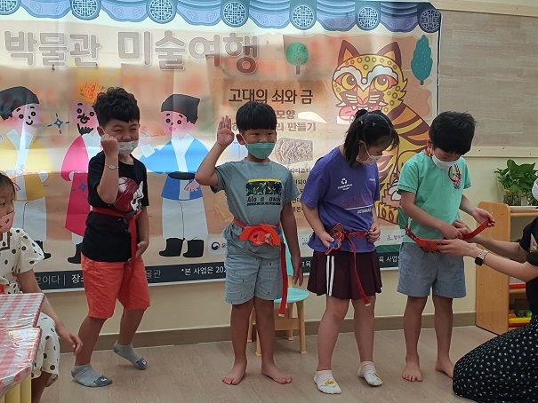 -사업명 : 신나는 박물관 여행 2회차 -사업일시: 2021. 8.11(수) -내 용 : 지난 1회차 박물관 방문 시 감상했던 호랑이 모양 허리 고리띠를 회상하면서 나만의 허리 고리띠 만들기를 즐겨보며 유물을 감상하고, 이를 예술활동으로 자신의 느낌을 표현 해볼 수 있는 기회가 되었습니다. |
