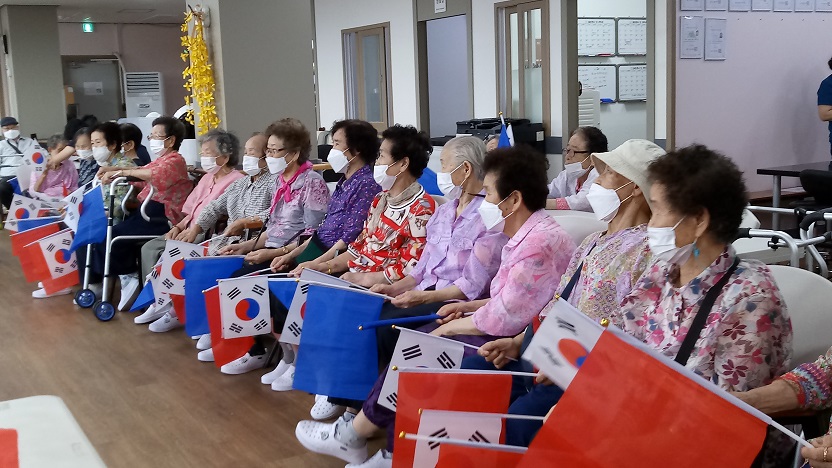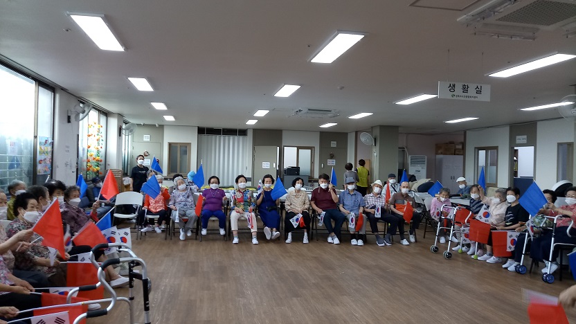 -사업명 : 맞춤형 신체 프로그램 “대한독립만세” -사업일시 : 2021. 08. 11(수) -내 용 : 태극기와 청기백기를 들고 진행자에 말에 따라 색깔 깃발과 태극기를 올리고 내립니다. 게임 규칙을 이해하고 실행함으로써 색에 대한 구별 능력을 향상시켜 인지기능 향상에 도움을 줄 수 있습니다. 신나는 율동과 함께 레크레이션이 동반되니 매우 즐거워하셨습니다. |