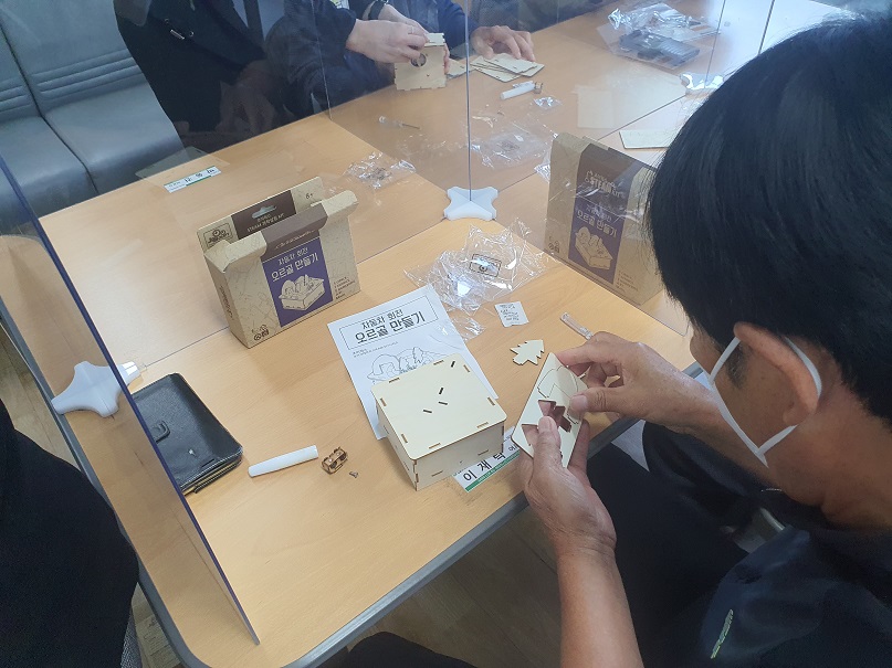 -사업명 : 9월 미술활동(공예: 자동차 회전 오르골 만들기) -사업일시 : 2021. 09. 24.(금) -내 용 : 기억학교에서는 2021년 과학문화바우처 지원사업 2차 활동으로 뮤직박스인 “자동차 회전 오르골 만들기”를 하여 심리정서적 안정감과 성취감을 얻고자 하였으며 태엽의 작동원리와 음악과의 상호관계를 이해하고 어르신 개개인의 작품에 대한 만족도가 매우 높으셨읍니다. |