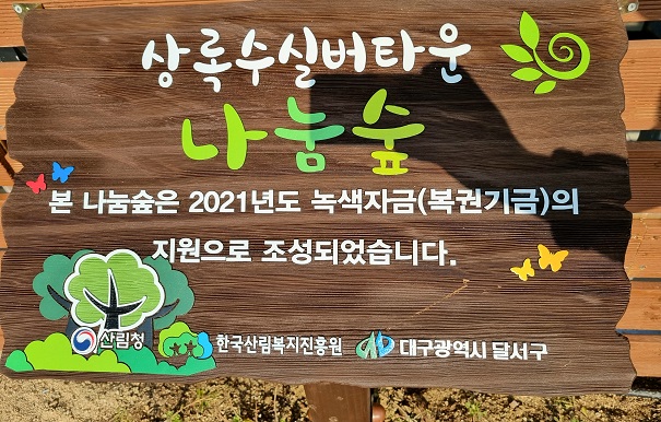 -사업명 : 상록수실버타운 옥상 나눔숲 조성 -일 자 : 2021. 10 -내 용 : 도심 속 상록수실버타운 옥상에서는 녹색자금 나눔숲이 조성 되었습니다. 적막한 옥상에 녹색 휴식공간을 제공하는 의미 있는 사업이었습니다. 덕분에 어르신들이 이용하시는 옥상에 초록빛 숲이 만들어지고, 숲을 배우고 느끼는 체험의 기회를 얻을 수 있을 것 같습니다. 환경을 개선함으로써 어르신들의 스트레스 완화 및 삶의 질 향상에 기여할 수 있도록 하겠습니다. 나눔숲 사업에 지원 및 도움을 주신 산림청, 한국산림복지진흥원, 달서구청에 감사드립니다. |