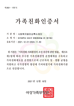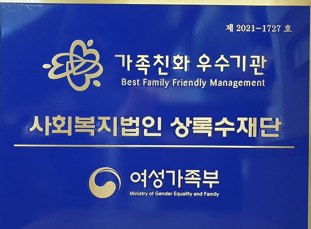 저희 상록수재단이 여성가족부로부터 가족친화기관 인증을 받았습니다. 이 가족친화기관인증은 '가족친화 사회환경의 조성 및 촉진에 관한 법률' 제 15조에 따라 여성가족부가 심사하는 13개 항목에 적합한 모범기관에게 주어지는 인증입니다. 이번 가족친화기관 인증뿐만 아니라 보다 더 종사자들의 처우 개선과 워라벨 확립을 위해 한 걸음 더 나아가는 상록수재단이 되겠습니다. 감사합니다. |
