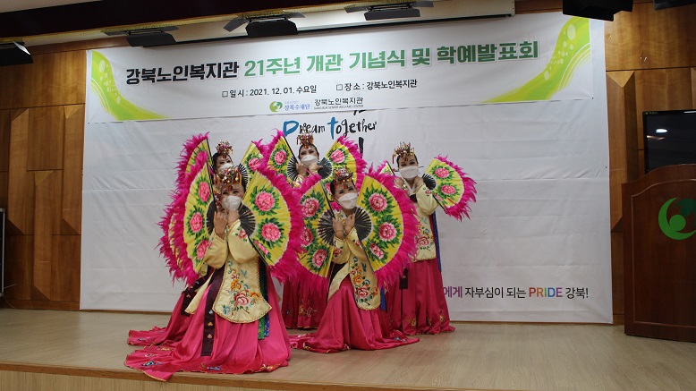 -행사명 : 강북노인복지관 21주년 개관 기념식 및 학예 발표회 -일 시 : 21. 12. 01. (수) -내 용 : 이번 21주년 개관 기념식 및 학예 발표회를 통해, 이용 어르신들의 소속감 및 자긍심을 고취하고 복지관의 비전 및 운영방침을 공유함으로써 지역사회 내 노인복지서비스 중추기관으로서의 위상과 역할을 정립하는 시간을 마련하였으며, 강북청춘대학을 통해 갈고 닦은 실력으로 이용 어르신들의 작품(서예, 사진)들은 복지관 2층 로비에 전시, 공연은 복지관 3층 강당에서 진행하여 코로나19의 대유행 및 장기화로 인해 심리 및 정서적으로 많이 힘들었을 상황에 복지관 이용 어르신들에게 힐링이 될 수 있는 시간을 마련하였습니다. |