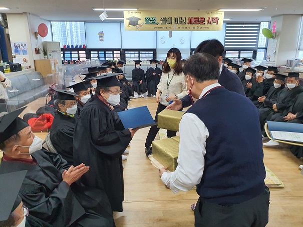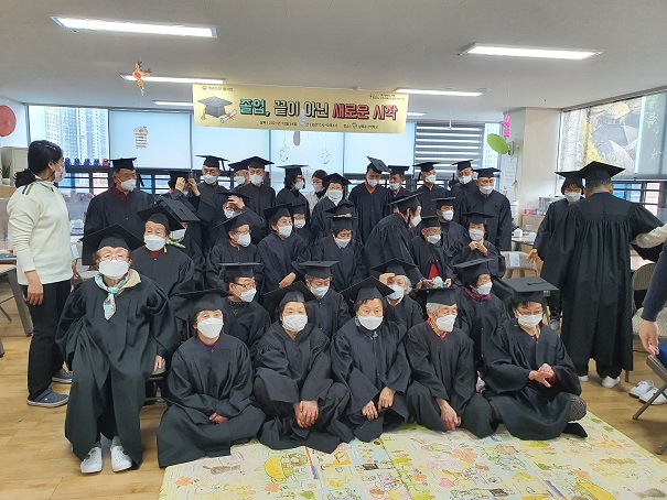 -행사명 : 특별한 데이(수료식 : 졸업, 끝이 아닌 시작) - 일 자 : 2021. 12. 24.(금) - 내 용 기억학교에서는 특별한데이 일환으로 일 년 동안 학교에 다니며 열심히 공부 및 활동을 하신 어르신께 감사의 마음을 전달하는 시간을 가졌습니다. 평소에 입기 어려운 사각모와 가운을 입고 수료식에 임하는 어르신들의 모습이 장관이었으며 개근상 및 특별상 그리고 선물을 받는 어르신들께서 무척 감격하셨습니다. |