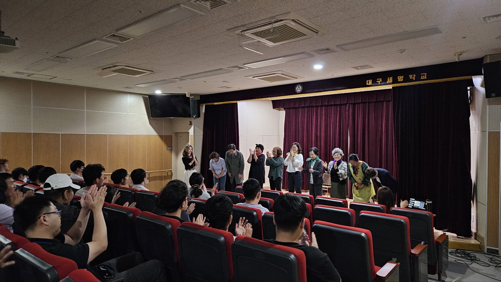 - 사업/행사명 : 2023년 지역문화플랫폼 숏폼 "인생여행" 연극 - 기간/일시 : 2023. 10. 27.(금) - 내용 한국노인종합복지관의 지원으로 6월부터 10월까지 4개월 간 성서노인종합복지관 7명의 어르신과 3명의 봉사자와 함께 "인생여행" 연극프로그램을 진행하였습니다. 특수학교 친구들에게 연극공연을 보여주며 함께 울고 웃을 수 있었던 #세명학교 친구들과 100세 시대를 함께 지내고 있는 #성서노인종합복지관 어르신들, 또, 젊음의 중심에 있는 #계명문화대학교 학생들과 지역사회 주민들에게도 "인생여행" 연극을 함께 공유할 수 있는 시간이 있어서 너무나도 행복했습니다. 100세 시대, 100세를 이끌어가는 인생선배들과 4개월의 짧은 여정을 끝으로 다음을 기약하며 행복한 "인생여행"을 마무리할 수 있었습니다! 해피해피 시니어 참여자들이 멋있는 모습으로 연극할 수 있게 장소를 제공해 주신 #세명학교, #계명문화대학교에 감사드리며 연극을 통해 어르신들의 감정을 이끌어내고, 완벽한 무대까지 함께 옆에서 응원해 주신 #나무테랑_식구들께도 감사의 인사를 드립니다. 앞으로도 성서노인종합복지관 어르신들이 100세까지 행복한 여행이 될 수 있도록 성서노인종합복지관도 노력하겠습니다! |