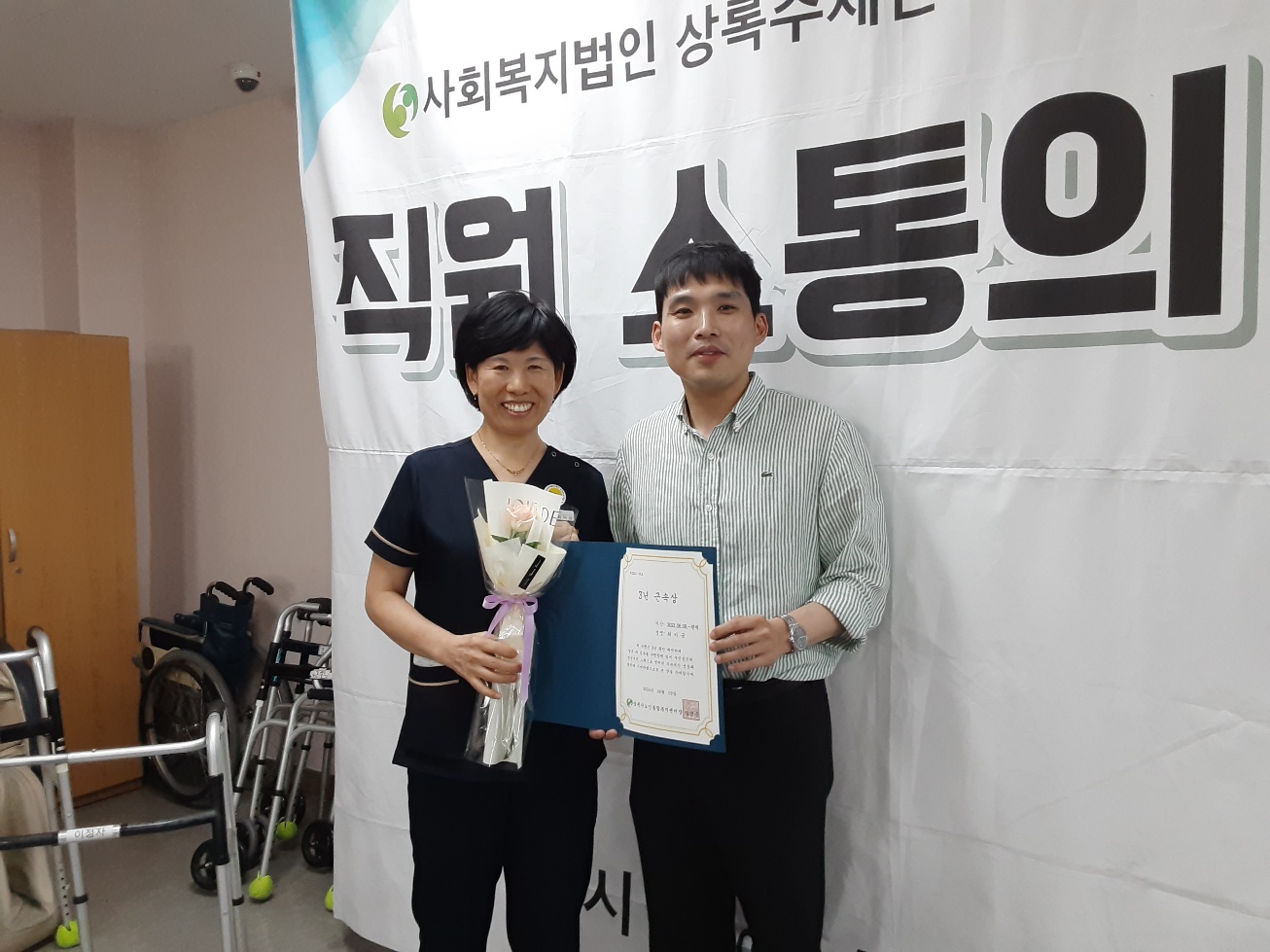 - 사업/행사명 : 6월 직원소통의 시간 - 기간/일시 : 2024. 6. 18. - 내용 상록수노인종합복지센터에서는 매월 모든 직원이 모여 간담회를 실시하고 있습니다. 센터에서 그 달 있었 던 잘못된 점을 개선하고 다음 달에는 좀 더 나은 서비스를 제공하도록 다짐하였으며 직원들이 적극적으 로 주어진 업무를 성실히 수행하도록 동기부여 차원에서 매달 우수직원 1명을 선정하여 상장과 더불어 소정의 상품권을 증정하고 있습니다. 근속직원에 한하여 1년 이상 근속할 경우 상장과 꽃 한 송이를 5년, 10년, 15년 등에 해당하는 직원은 상장과 더불어 꽃다발을 증정하는 행사를 하고 있습니다. 소통시간을 마치며 7월 실천목표인 “ 등록인원 65명 출석인원 60명!!”이라는 표어를 통해 실천을 다짐하 였습니다. 마지막으로 긴급한 상황 발생 시 질식에 대한 대처 능력을 기르기 위해 2인 1조로 하임리히법을 연습을 통해 직원 모두가 대처할 수 있는 힘을 기르고 있습니다.