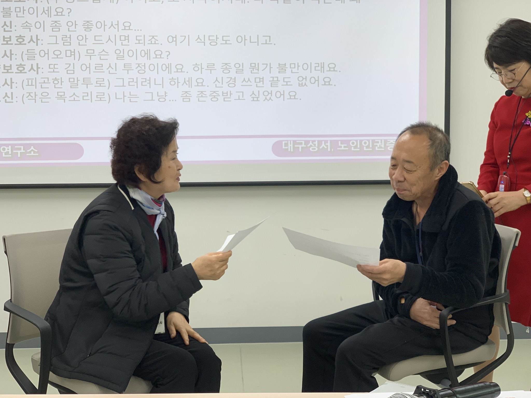- 사업/행사명 : 2025년 상반기 노인 권익증진 교육 - 기간/일시 : 2025. 4. 18.(금) 10:30~12:00 - 내용 4/18(금) 월성은빛복지관에서는 어르신들과 함께 ‘노인 권익 보호 및 인권 증진 교육’을 진행했습니다. 사례를 통한 공감, 질문을 통한 소통으로, 인권의 소중함을 다시 한 번 되새기는 의미 있는 시간이었습니다. 실제 사례로 역할극까지 진행하며 인권의 중요함을 더 상기해 보았습니다. 노인 인권은 단지 보호의 대상이 아닌, 우리가 함께 지켜가야 할 가치입니다. 작은 배움이 큰 변화를 만들고, 그 변화가 우리 지역사회의 따뜻한 힘이 되기를 기대합니다. 앞으로도 어르신 한 분 한 분이 존중받고 행복한 삶을 살아가실 수 있도록 월성은빛복지관은 늘 가까이에서 함께하겠습니다. 참여해주신 모든 어르신들께 감사드립니다! |