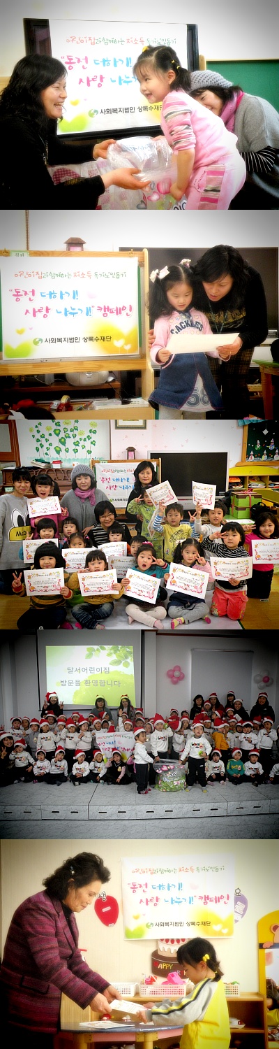 지난 11월1일부터 12월 17일까지 진행된 2010년 동전더하기! 사랑나누기! 모금행사가 종료되어, 참여원아들에게 "따뜻한 마음상"을 전달하였습니다. 참여한 상록수,월배,달서,금빛,고운별 어린이집 원장님과 부모님들께 감사 드립니다. 이러한 따뜻한 마음이 모아진 모금액으로 지역 독거노인의 따뜻한 겨울나기에 필요한 물품을 지원 할 예정입니다. |