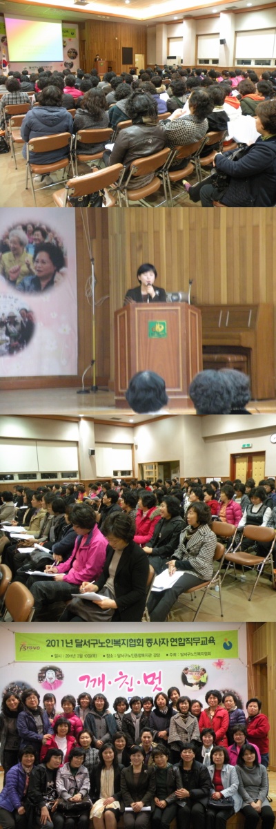 2011년 3월 10일(목) 달서구노인종합복지관 강당 , 달서구노인복지협회에서 주최하는 "임종을 위한 호스피스 교육" 이라는 주제로 실시된 종사자 연합직무교육에 40명의 상록수재단 종사자들이 참석하여, 교육을 마치고 돌아왔습니다.