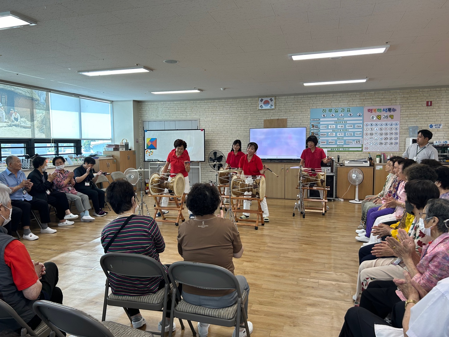 - 행사명 : 대한노인학대예방협회 난타 특별공연 - 일자 : 2024. 6. 28.(금) - 내용 6월 28일(금) 대한노인학대예방협회와 연계하여 어르신들이 좋아하는 특별 난타 공연을 관람하였습니다. 열정이 가득담김 빨간 옷을 맞춰입은 난타 봉사단의 소개에 이어 어르신들이 좋아하시는 노래에 맞춰 신명나는 장구난타가 이어졌습니다. 아름다운 율동과 함께 한 난타 공연에 어르신들 모두 함께 박수 치시며 좋아하셨습니다. 마지막에는 사회자 및 공연단의 가요 메들리에 맞춰 함께 흥겹게 춤을 추는 시간도 가져보았습니다, 어르신들이 무료한 일상을 보내지 않으시도록 다양한 공연 및 재능기부활동을 연계하기 위해 열심히 노력하고 있습니다. 앞으로도 어르신들의 신명나는 일상생활 지원을 위해 발로 뛰는 상록수기억학교가 되겠습니다. |