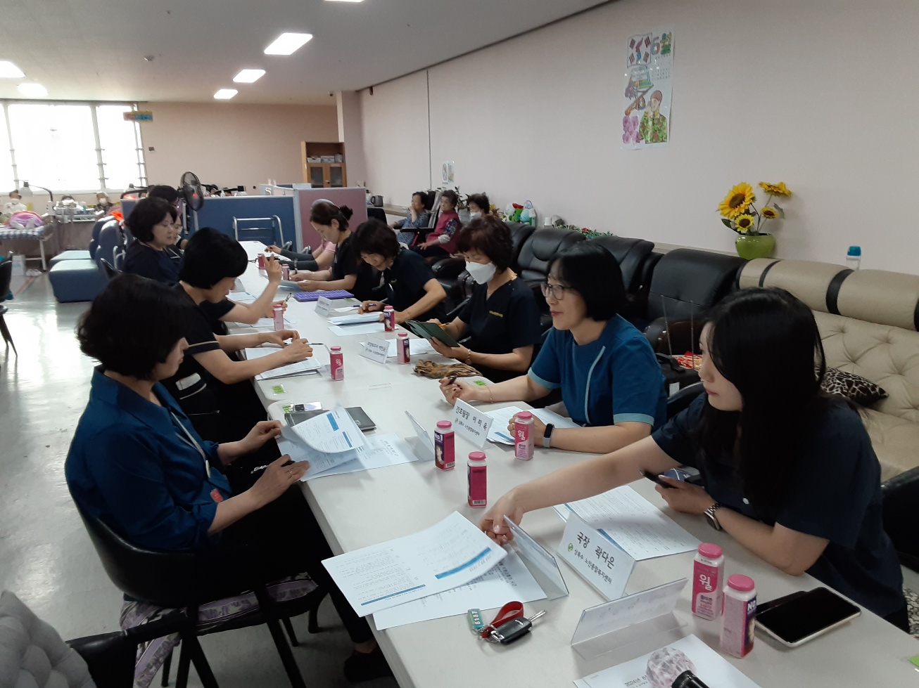 - 사업/행사명 : 6월 직원소통의 시간 - 기간/일시 : 2024. 6. 18. - 내용 상록수노인종합복지센터에서는 매월 모든 직원이 모여 간담회를 실시하고 있습니다. 센터에서 그 달 있었 던 잘못된 점을 개선하고 다음 달에는 좀 더 나은 서비스를 제공하도록 다짐하였으며 직원들이 적극적으 로 주어진 업무를 성실히 수행하도록 동기부여 차원에서 매달 우수직원 1명을 선정하여 상장과 더불어 소정의 상품권을 증정하고 있습니다. 근속직원에 한하여 1년 이상 근속할 경우 상장과 꽃 한 송이를 5년, 10년, 15년 등에 해당하는 직원은 상장과 더불어 꽃다발을 증정하는 행사를 하고 있습니다. 소통시간을 마치며 7월 실천목표인 “ 등록인원 65명 출석인원 60명!!”이라는 표어를 통해 실천을 다짐하 였습니다. 마지막으로 긴급한 상황 발생 시 질식에 대한 대처 능력을 기르기 위해 2인 1조로 하임리히법을 연습을 통해 직원 모두가 대처할 수 있는 힘을 기르고 있습니다.