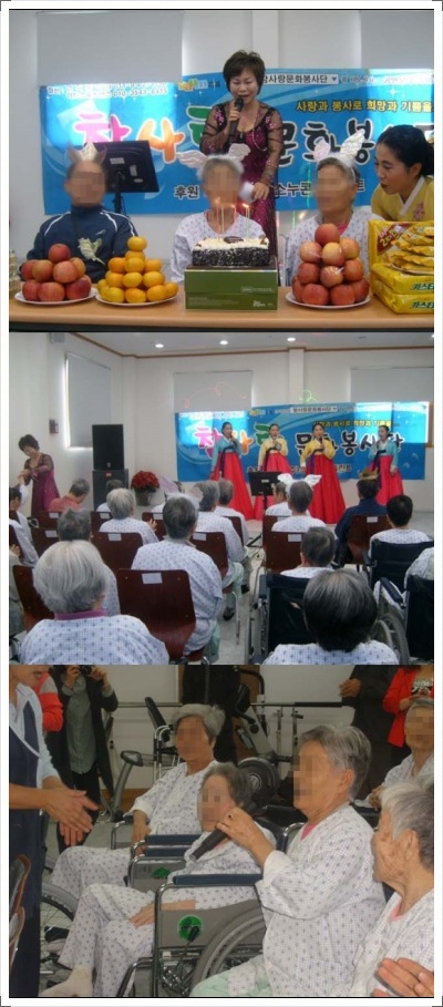 ![]() 생신축하 합니다~ ♬ 생신축하합니다~♪ 10월 29일. 송현그룹홈 강당에서 '10월 생신잔치'가 열렸습니다. 생신을 맞으신 어르신께서는 여러 사람들의 축하속에서 푸짐한 생신상을 받으셨습니다. 그리고 참사랑 문화봉사단의 노래공연으로 오늘 하루 정말 신나고 즐거운 생신잔치가 되었습니다. |