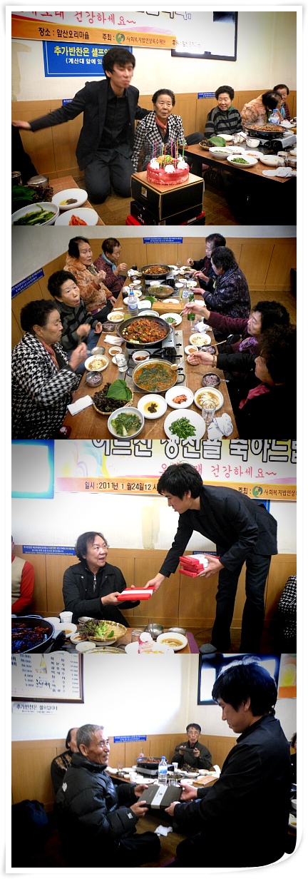 2011년 1월 24일(월)12시 앞산오리마을에서 1월에 생신을 맞으신 13분의 어르신을 모시고 생신 및 외식지원서비스를 실시 하였습니다. 쑥스러워 하시며 축하곡을 함께 부르시는 어르신들 얼굴 가득 미소가 떠나지 않았습니다. 어르신들 항상 행복하시고 건강하세요~♡ |