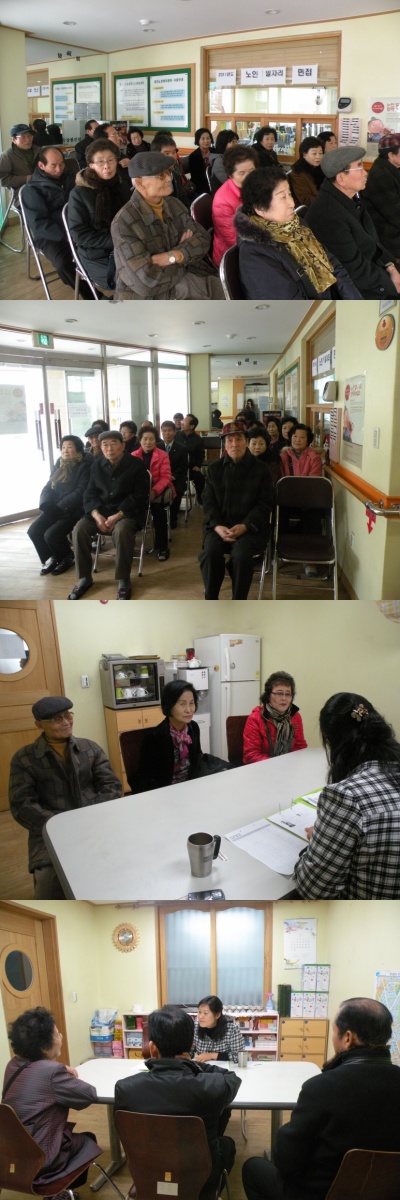 2011년 노인일자리 참여자모집과 관련하여 10일(목),11일(금) 양일간 면접을 실시하였습니다.저희 센터의 독거노인을 위해 도움의 손길의 주실 노인일자리 참여신청하신 모든 어르신들게 감사의 인사를 드립니다. 모두모두 좋은결과가 있기를 바랍니다. 어르신들 화이팅~!